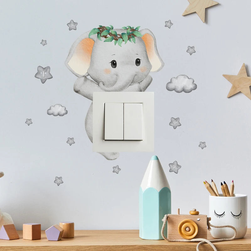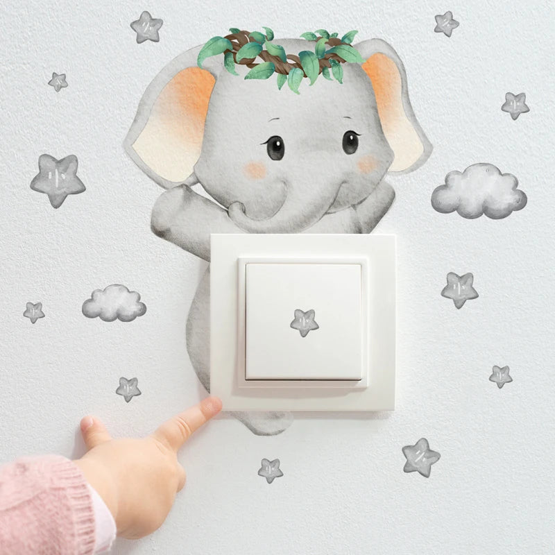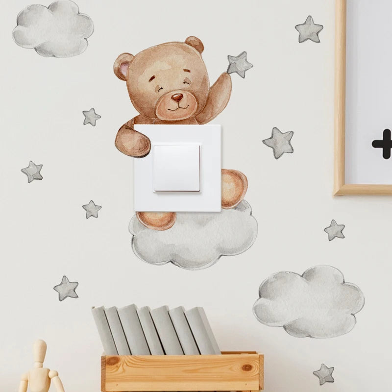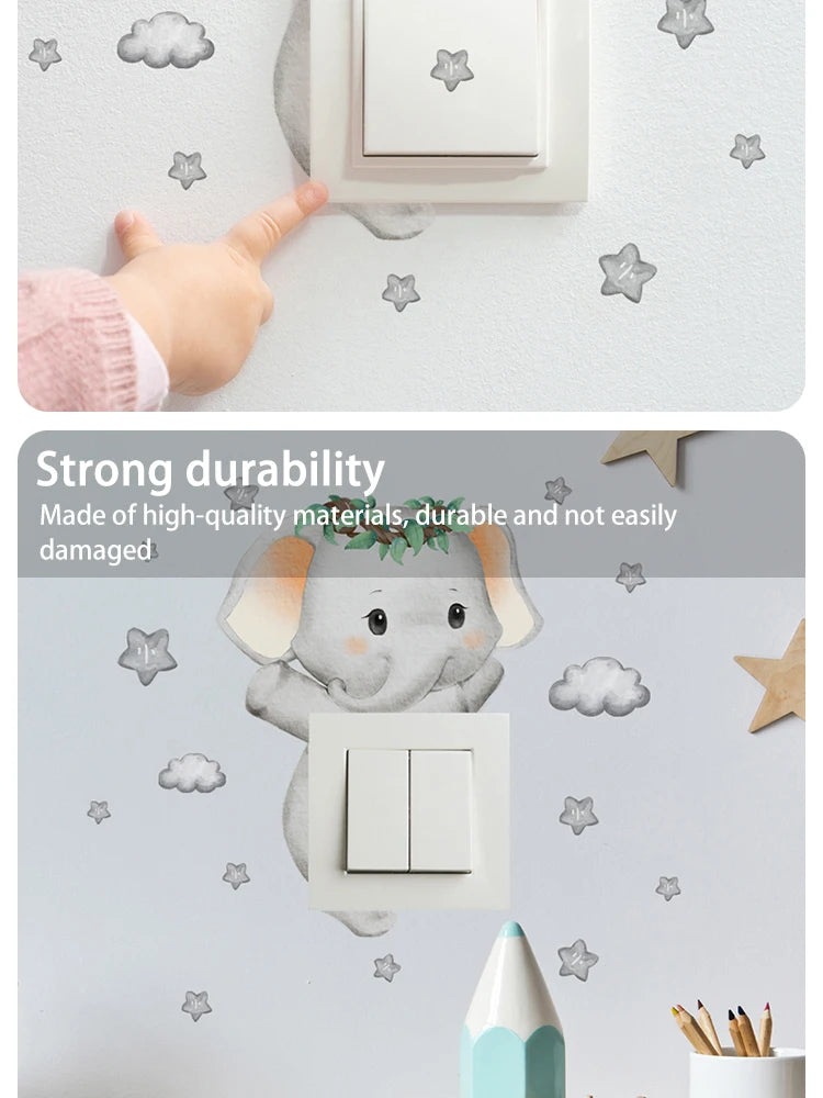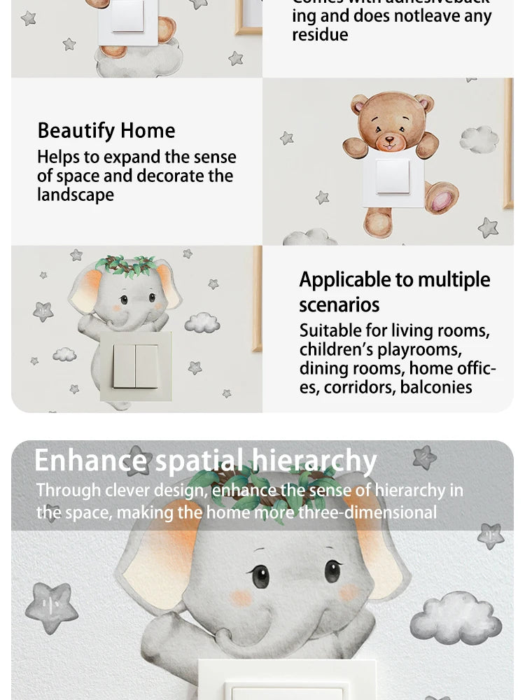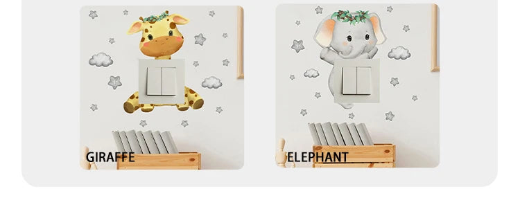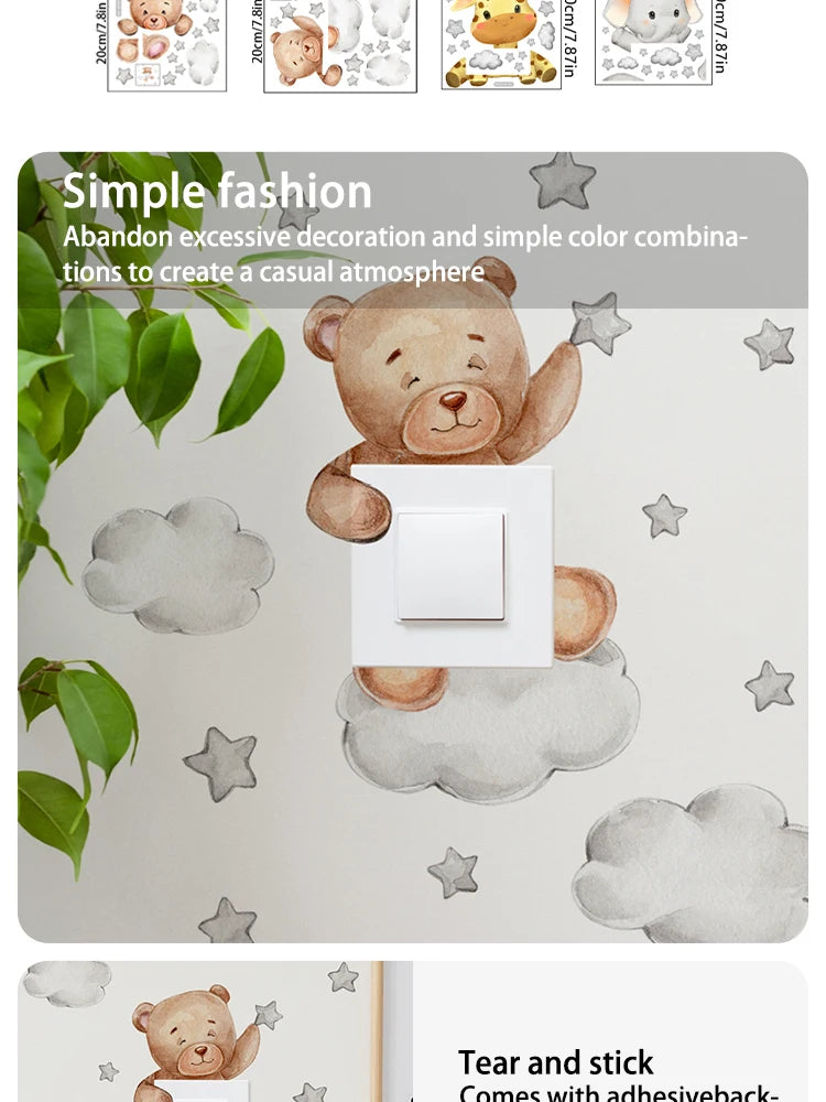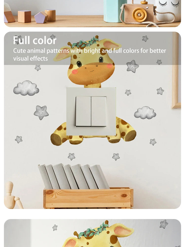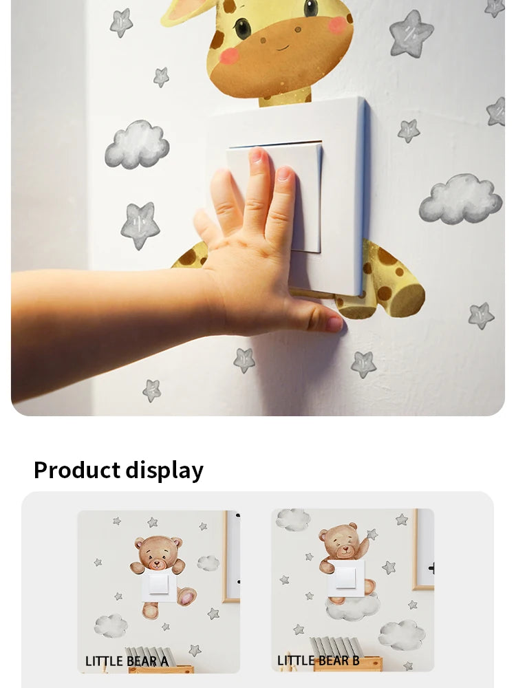 Cute cartoon design: Selected cartoon bears, giraffes and elephants, combined with soft white cloud-shaped switch stickers, forming a series of lively images. Bright colours and storytelling patterns stimulate children's imagination and add a little sweetness and wonder to their dreams.