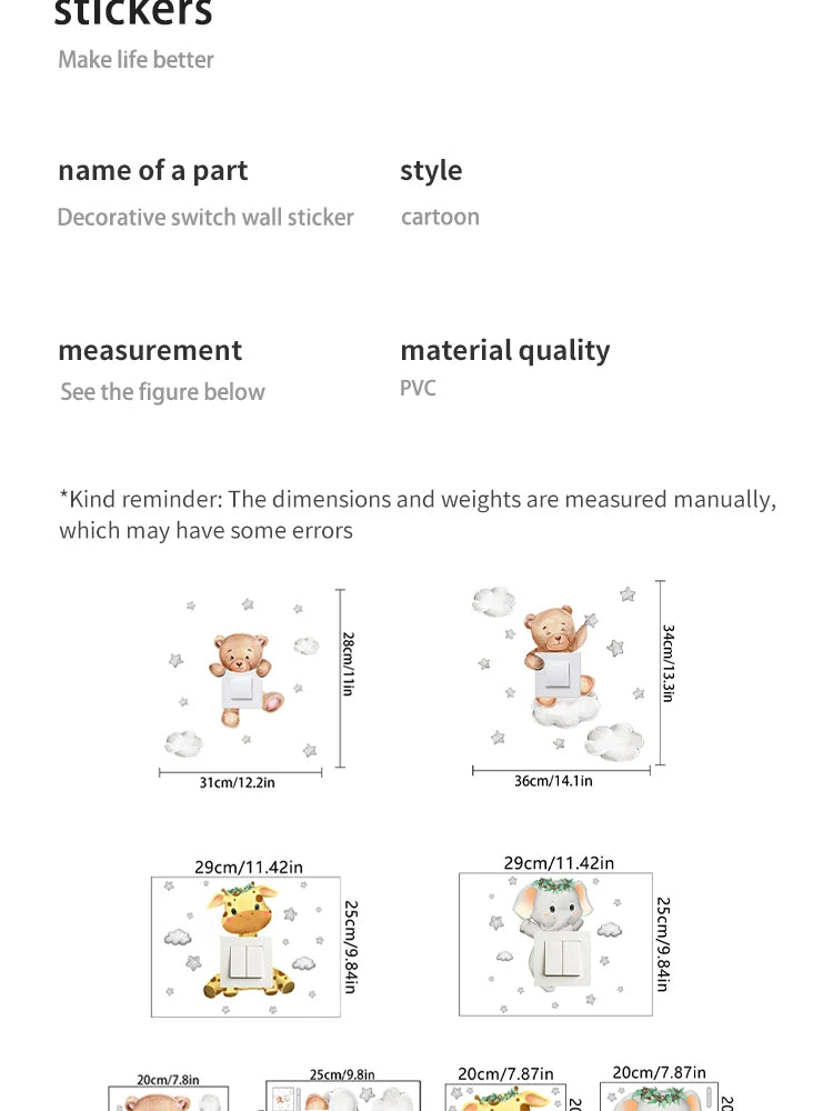 Multi-scenario application: not only suitable for children's room switch decoration and wall embellishment, but also suitable for the living room, kindergarten, play area, etc., to bring a touch of warm children's elements to these spaces, creating a harmonious and pleasant family and learning environment.
