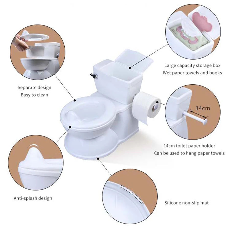 Practical storage box to store training pants and temporary towels. Extended paper holder for storing paper towels to clean the toilet after potty training. The splash guard avoids wet pants for boys and makes potty training comfortable and fun.