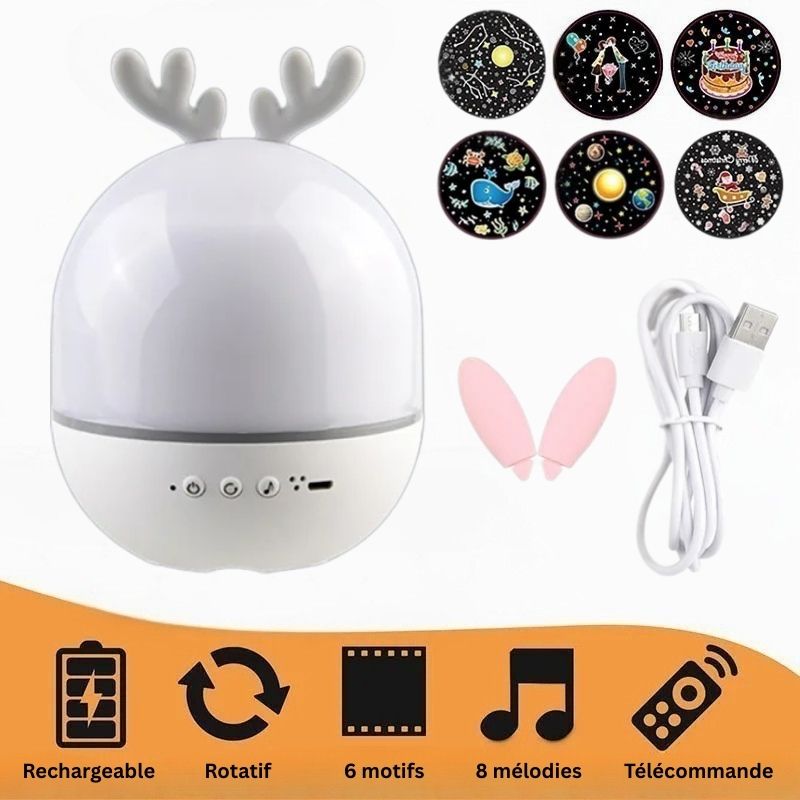 Ce projecteur multifonction peut être utilisé comme lampe de projection lorsqu’on retire la protection, ou comme veilleuse classique en la remettant en place. Les 6 films de projection inclus permettent de varier les thèmes pour émerveiller votre enfant chaque soir. Avec ses cinq effets lumineux (blanc, bleu, blanc chaud, et plus), et sa fonction rotative, il crée un ciel étoilé en mouvement qui stimule l’imagination et apaise les peurs nocturnes.