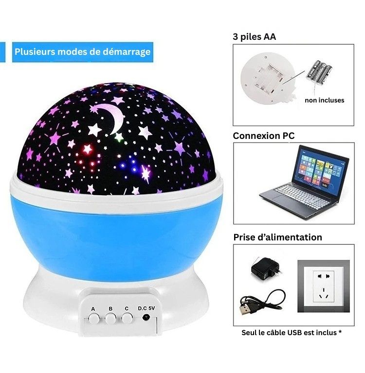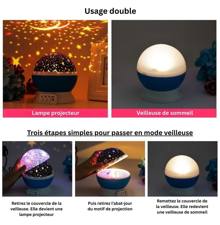 Apportez une ambiance magique et relaxante à la chambre de votre enfant avec ce Projecteur LED rotative. Il transforme murs et plafond en un ciel étoilé captivant, projetant lune et étoiles en couleurs changeantes pour créer un environnement rassurant et apaisant. Parfait pour les enfants qui ont peur du noir, ce projecteur stimule leur imagination tout en servant de veilleuse sûre et douce, idéale pour accompagner bébé ou enfant jusqu’au sommeil. Son abat-jour amovible permet de l’utiliser également comme une veilleuse classique, offrant aux parents un contrôle facile de l’éclairage nocturne.